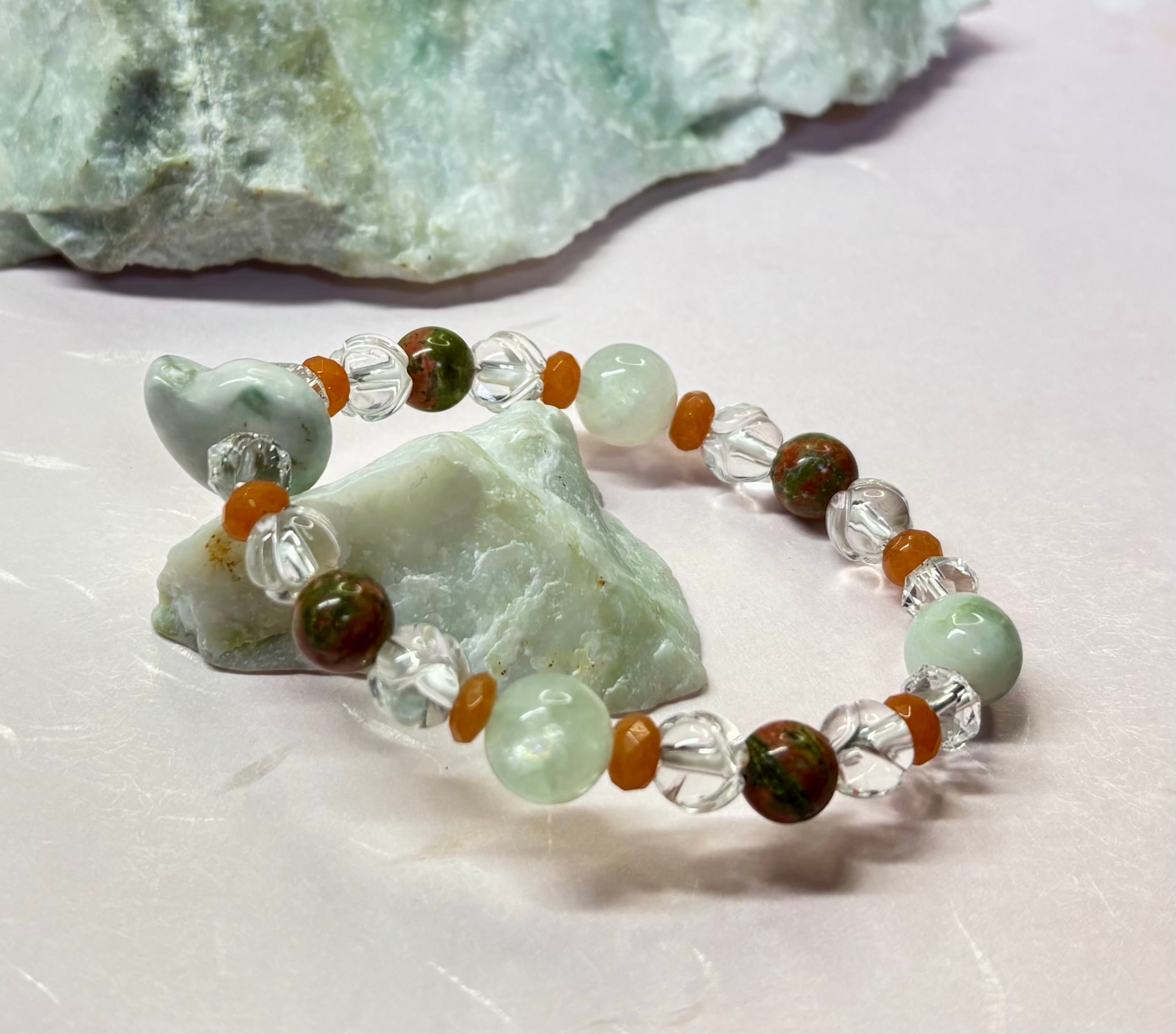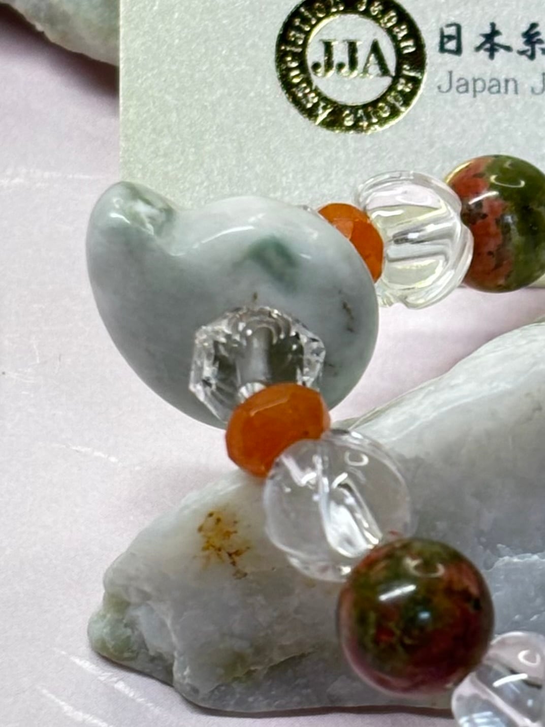 このブレスレットは、日本の霊石「糸魚川翡翠」を主軸として、厳選した天然石を八方位に配置することで、『エネルギーを変換・循環させる機能』をもつ、唯一無二のブレスレットとなっています。